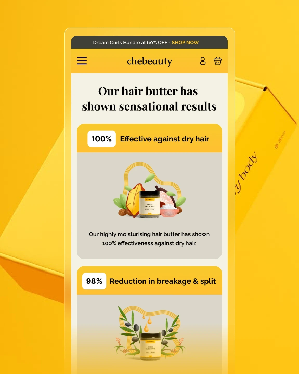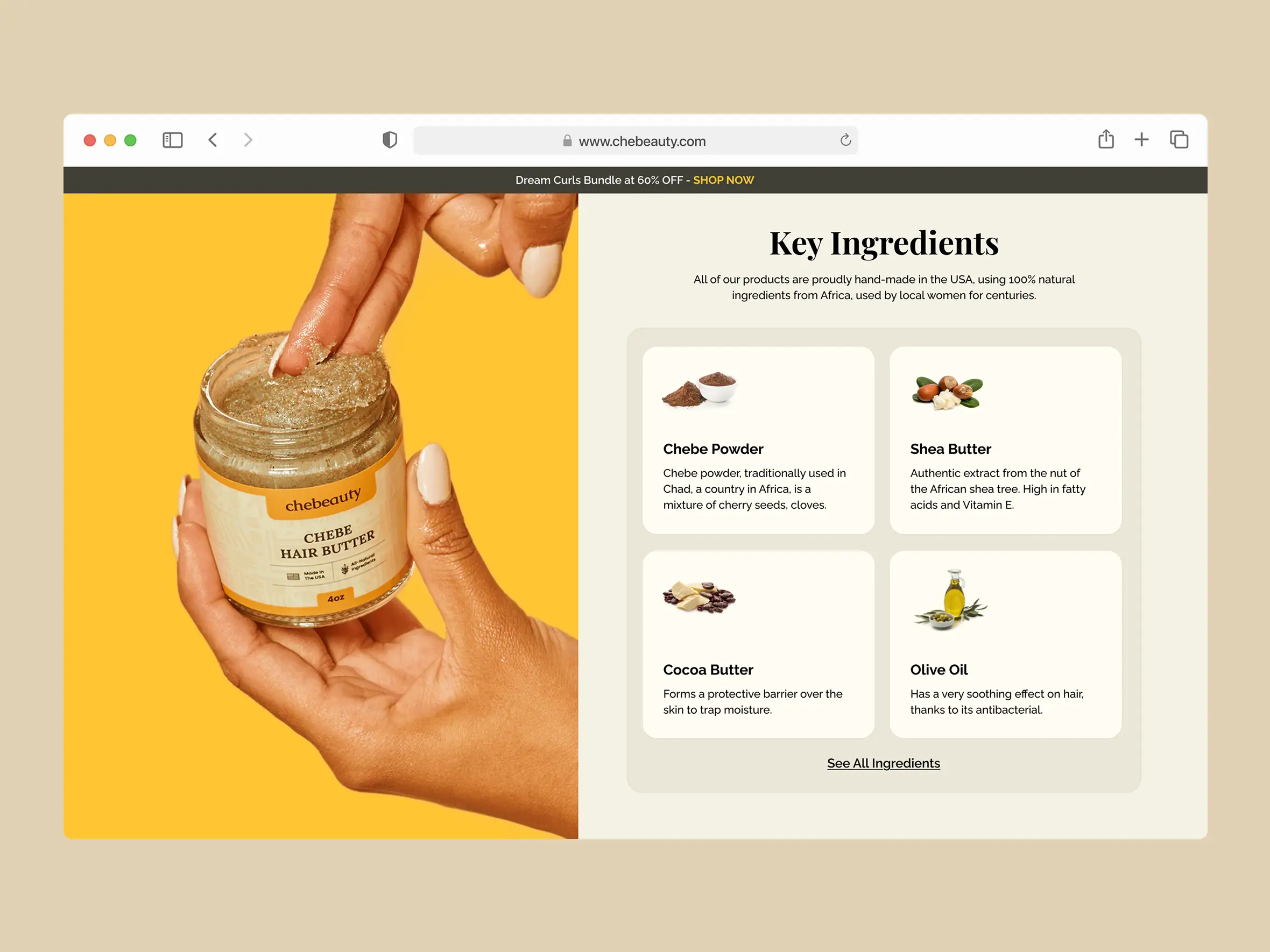 Chebeauty’s main advantage is its use of healthy, natural ingredients - something today’s shoppers actively look for. Highlighting key ingredients helps build trust and makes the product feel safe and effective. Studies show over 70% of beauty buyers prefer clean formulas, so showing this up front reduces doubts and increases the chance users will continue exploring or buy.