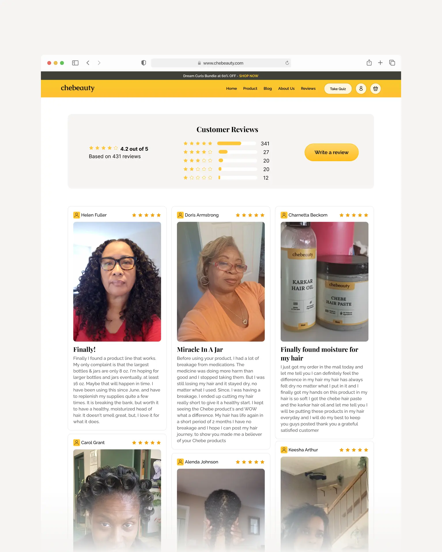 This review section combines star ratings, real user photos, and personal stories to build trust fast. The clear 4.2/5 average and breakdown of all 431 reviews help shoppers feel confident. Featuring highlighted reviews with detailed narratives and star ratings provides emotional resonance. All this boosts shopper confidence and conversion likelihood.