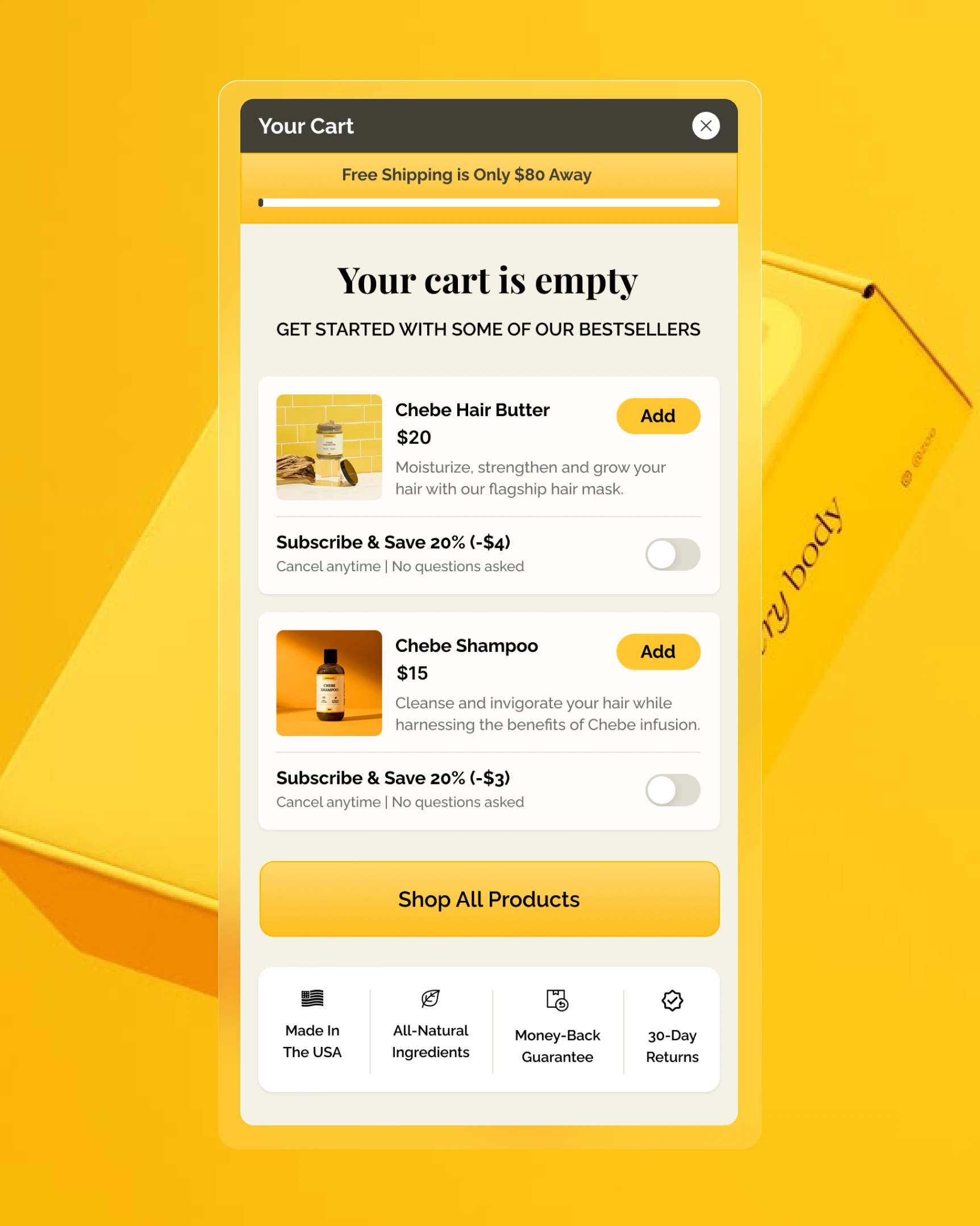 Instead of just saying “Your cart is empty,” the design shows top-selling products with direct “Add” buttons. This keeps users engaged and turns a drop-off moment into a chance to explore and shop. Trust signals like “Made in the USA” and “Money-Back Guarantee” are shown below to reduce hesitation and build confidence, even before users add anything.